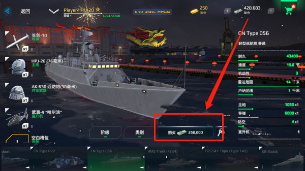 2、通过下方所示位置可切换不同的战舰,我们可通过消费游戏内的货币购买新的战舰;