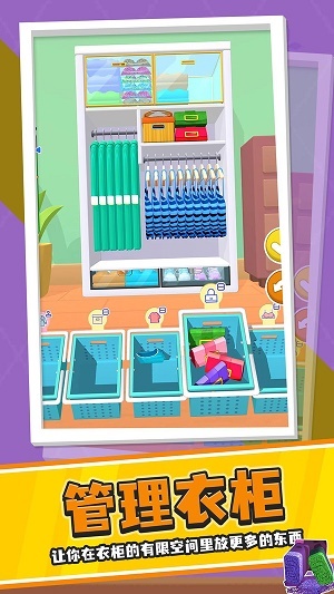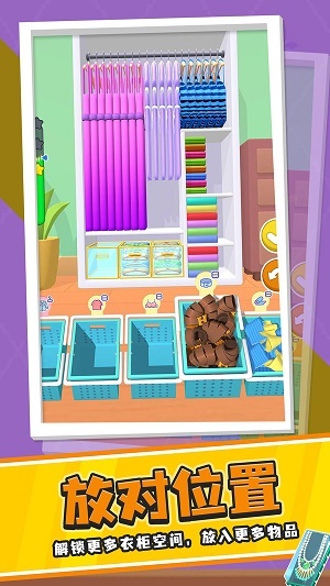衣柜整理大师是一款卡通休闲小游戏。游戏玩法很简单,只需把所有物品整齐摆放在衣柜里就行,没有任何限制。在这里,还能解锁更多衣柜空间,以便放入更多物品,玩法轻松又简单。