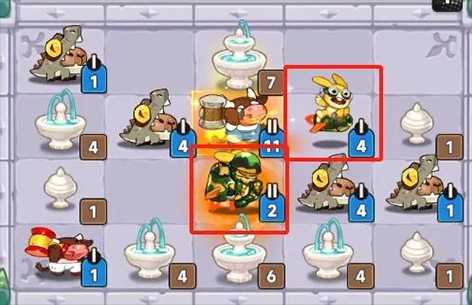 我们很容易发现,投手熊的扩散效果仅对其左右两个格子里的萌宠生效。因此在合成投手熊时,要尽量确保它的左右两侧存在萌宠或障碍物。我们需要重点考虑萌宠的站位安排,以及如何让投手熊升级后的扩散收益达到最大,而非不做任何规划就直接合成。