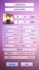进入游戏后,首先需要确认个人资料,其中涵盖姓名、年龄、气运、能力成长等各项属性,同时还能挑选特殊身份、资质等相关设定。待选择完毕,点击【确定】按钮即可正式启动游戏,而你的任务便是创建豪门家族、在上京地区称霸一方,并铸就能够延续百年的辉煌荣耀。