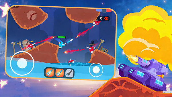 1、与多名玩家线上匹配展开坦克射击对战,左侧控制移动,右侧控制射击。