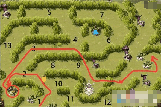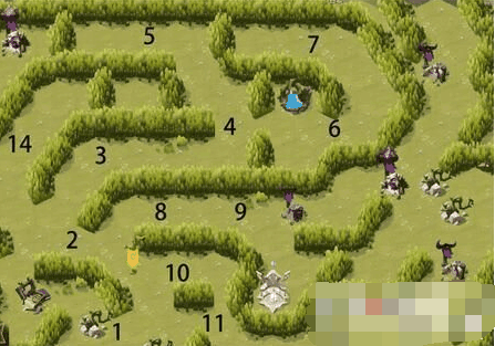 按图里的数字顺序清理14只怪物,收集完14个BUFF并招募2名绿裔队友后,前往左侧挑战绿裔队伍,打开草丛后再去右侧获取神器。一级绿裔队伍推荐刷取神器蛛丝手套,搭配普攻叠毒的玩法,先用一级英雄送死触发流血效果消耗敌人血量,最后派一队绿裔英雄收尾。