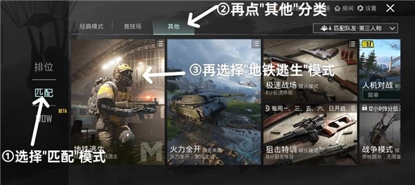 4、先选择“匹配”模式,接着点击“其他”分类,然后选择“地铁逃生”模式,点击就能进入,在深邃的战栗氛围中开启地铁逃生之旅。