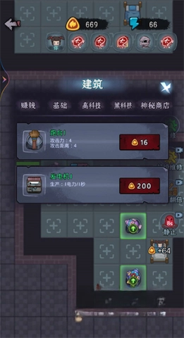 玩家需要通过发展经济来建造炮塔,以此抵御敌人的攻击。建造只能在房间内的空地上进行,点击空地后会弹出建筑菜单供玩家选择。