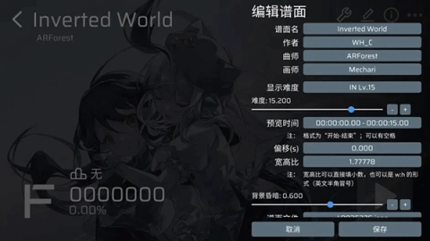 点击铅笔图标即可进入谱面设置界面,在这里您能调整谱面的各项参数,比如定数、宽高比等,调整完成后请记得保存您的设置。