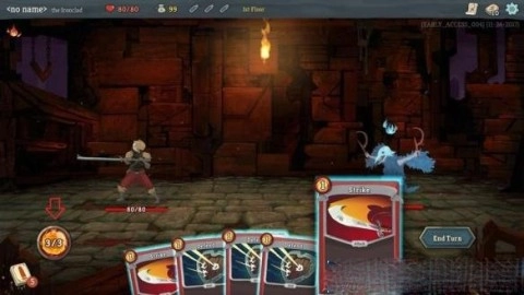 3. 当你点击冒险地图上的节点图标进入冒险时,若该节点遇到敌人,就会触发战斗。在战斗过程中,你需要灵活使用卡组里的卡牌来对抗敌人。游戏刚开始时,每回合你能从卡组中抽5张卡牌,要留意左下角的能量球,它会显示你本回合可使用的能量值。