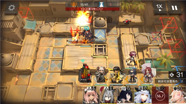 4、进入到关卡后先是经典的双先锋开局,可以看到地图上已经出现了三个战术防御者组长虎视眈眈,因此在先锋开局费用足够后需要优先处理掉这三个防御者组长。这里如果有艾雅法拉的小伙伴可以直接高台开火山能够一次打死三个。