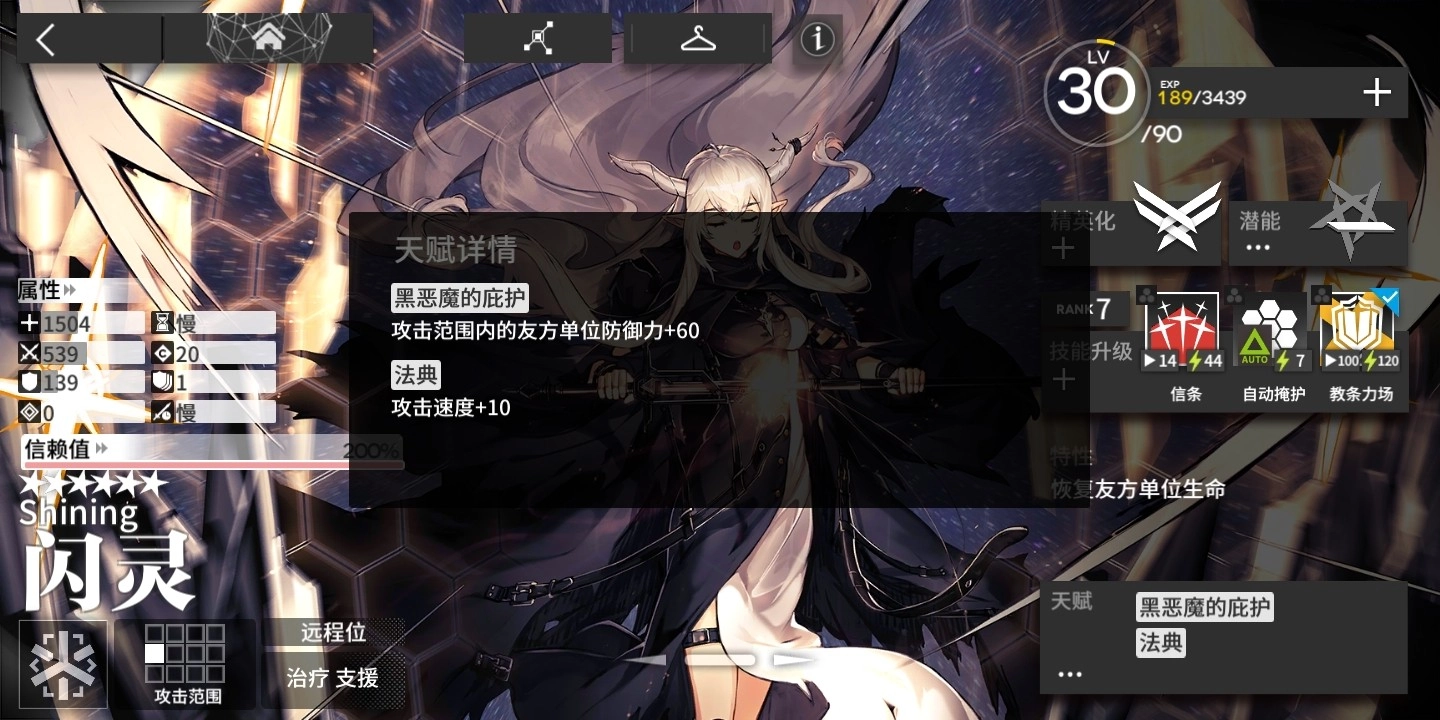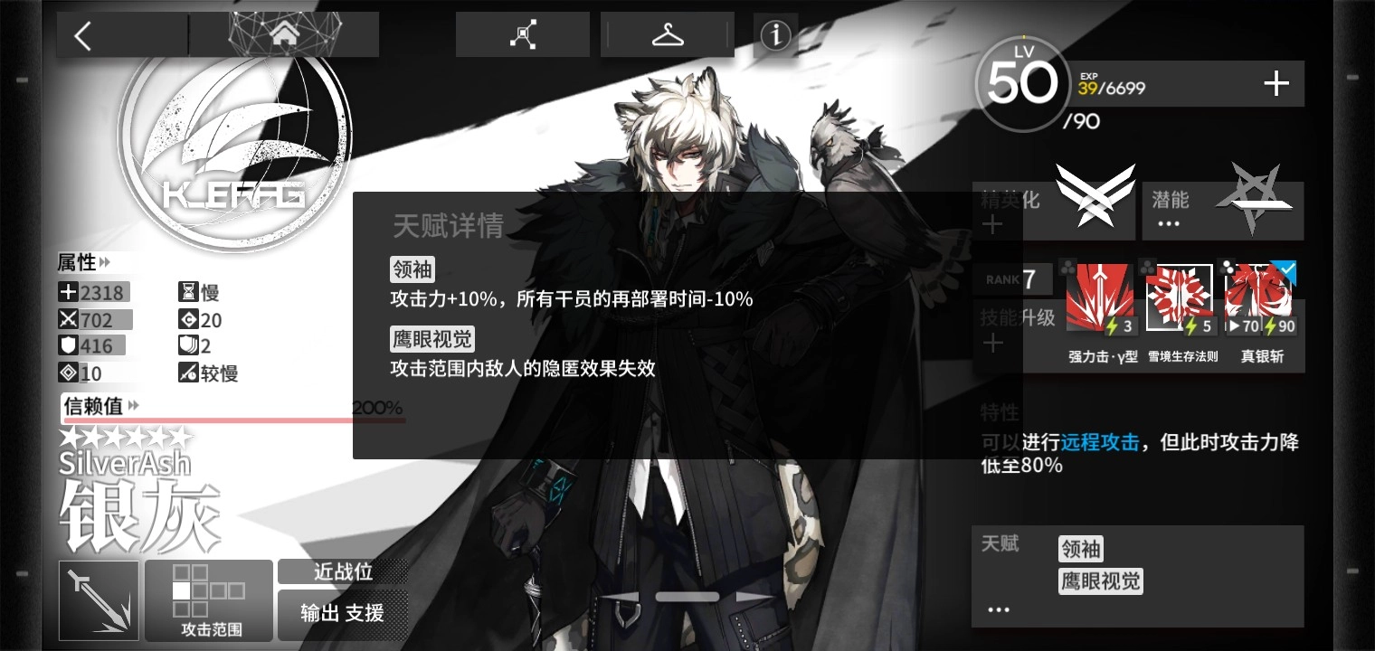 天赋简要分析:对于自身的攻击力有一定的提升效果,且加快全体干员的再部署时间,能够为工具人支援打法提供很好的基础条件;反隐能力则能够减小敌方隐匿单位不断消耗带来的医疗压力,使我方阵线尽早对其发动攻势,可以理解为是间接输出手段