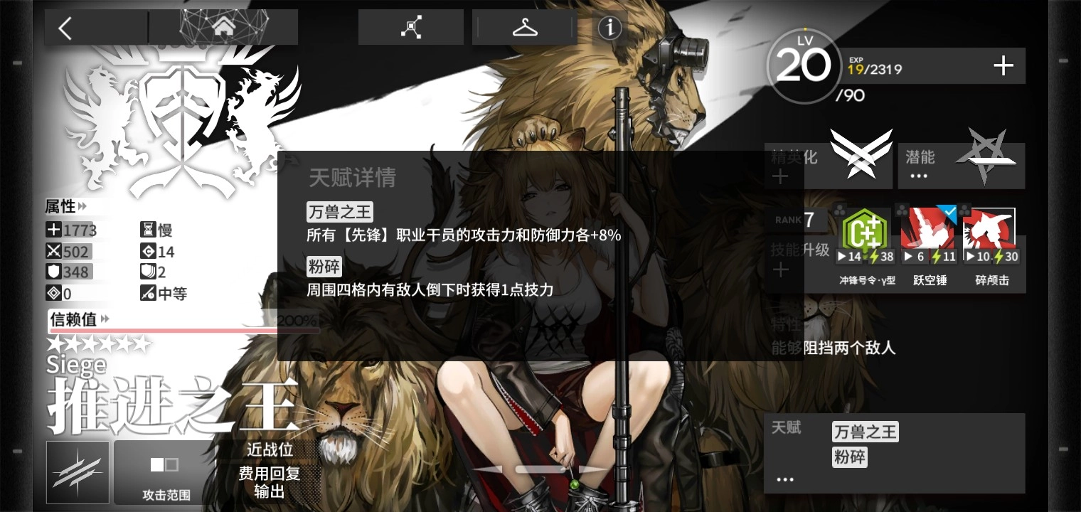 上位六星先锋风笛,精二天赋能为全体先锋增加技力;即使是精一阶段,也能为萌新补充不少输出。她的三技能“闭膛连发”,可以当作萌新前期过渡用的小决战技能。