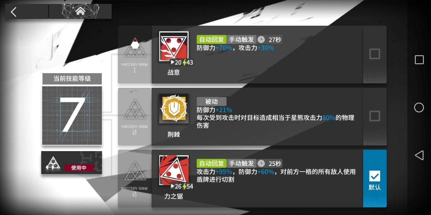 力之锯:抗压与降压时都非常好用,能够有效补足伤害输出,且敌方数量多而物抗低的单位有很好的应对能力,但通常还是用于硬抗敌方高物伤的精英单位