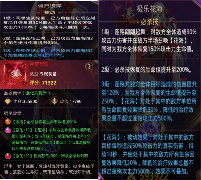 莲殇作为“绝技放大器”,她的被动技能和30级专武可以大额提升凯特琳绝技的伤害,必杀技的范围降疗以及被动禁疗的能力很好限制敌方辅助的回复效果。