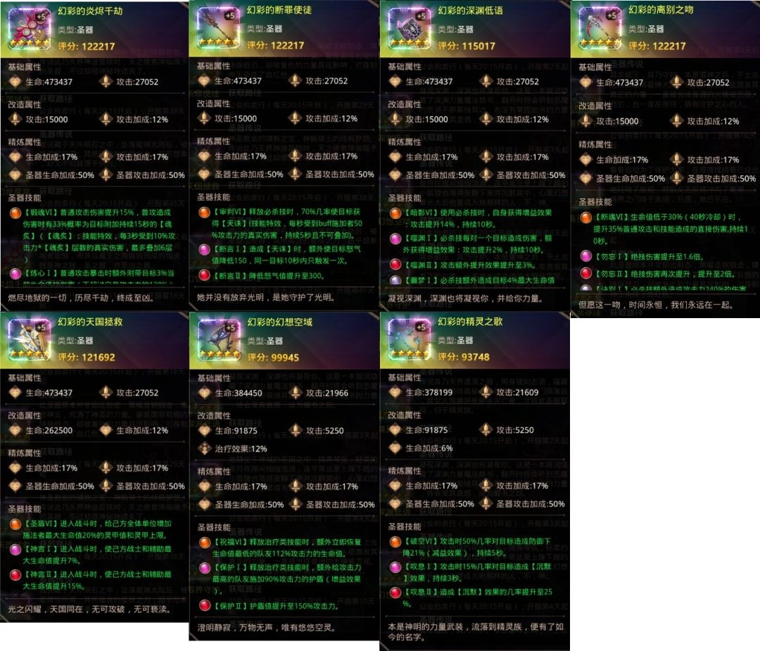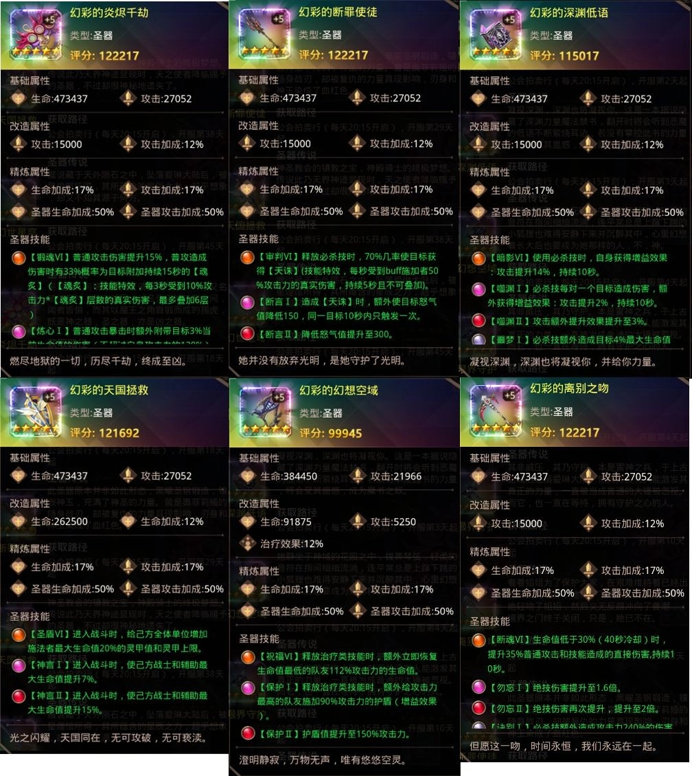 圣器方面两套一样,司弈带断罪使徒,卡牌带深渊低语,欧若拉带幻想空域,双子带精灵之歌,普罗/棉花带天国拯救。