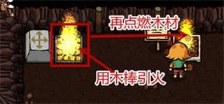 3、先在火堆前使用木棒,接着点燃木材堆,门便会开启,随后进入下一个洞穴。