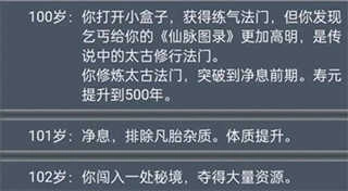 后续若达成100岁的条件,即可触发相应事件,玩家将获得仙脉图录,从而开启更为强大的修仙旅程。