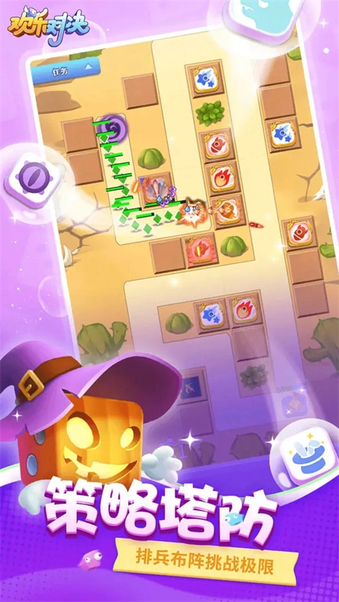 《欢乐对决》是一款融合了塔防、卡牌与对战元素的休闲竞技游戏。在这里,你既能体验趣味十足的卡牌玩法,也能收获轻松惬意的游戏乐趣。游戏打破了传统塔防的单调模式,创新性地加入随机机制与放置玩法:玩家可随机召唤布洛克,当两个点数相同的布洛克相遇时,便能合成点数更高的新布洛克。这种充满未知的设定大幅提升了游戏的可玩性,让玩家得以领略全新的塔防体验,重新燃起对塔防游戏的热爱。