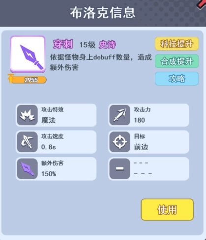 穿甲、泡泡和掠夺布洛克需要升级到3级,布洛克升级时每升一级就能增加一个攻击目标,3级的泡泡、穿甲和掠夺布洛克可以同时攻击3个敌人,这样穿刺的每次攻击都能触发额外伤害加成。暴风雪布洛克只需要一个就行,如果没有暴风雪布洛克,也可以用毒布洛克来替代。