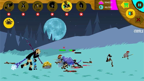 11、第十一关:冰冷山区,敌方几乎全是满级战斗单位。开局用6个矿工全力发展经济,先培养四排剑士,后期再开始训练巨人(带击退效果)。升级方面优先点矛士盾和剑士之剑。