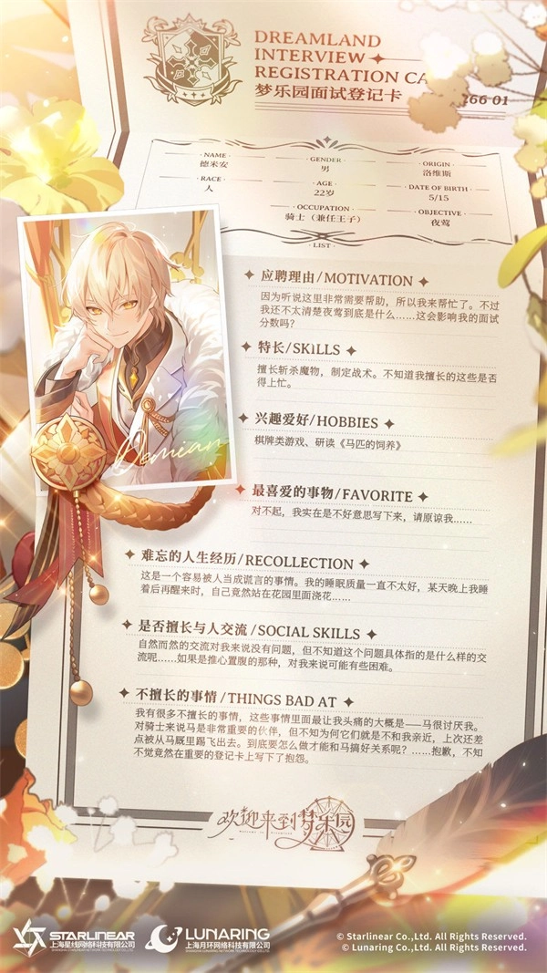 拂晓骑士团的首领德米安,同时他也是洛维斯的王子。他年轻有为,但从不骄傲,待人始终温和有礼。
