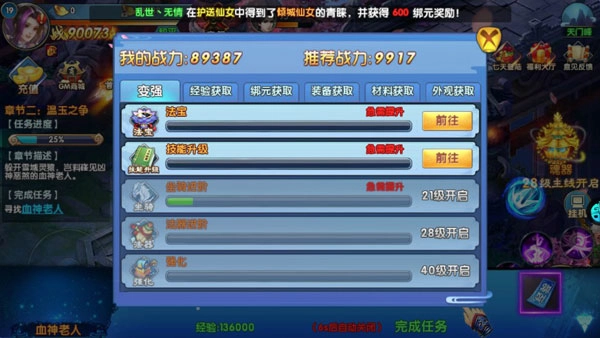 变强也就是战力的提升方式,这里主要表现在法宝、技能、坐骑、法器和强化等方面,而且等级的提升也会为你带来不错的战力。