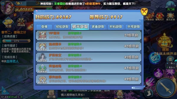 和元宝类似,绑定元宝作为游戏里的主要消耗资源同样关键,其用途主要体现在VIP副本、挑战副本、护送仙女、阵营战场以及野外挂机等场景中。