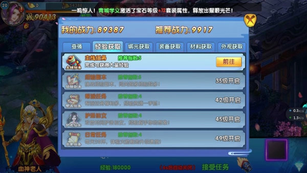 经验的获取主要推荐主线任务、经验副本、帮派任务、护送仙女和日程任务,这些日程都有一定的等级限制,而且有些只有在相对应的时间段才会开启,还有一项就是挂机了,但毋庸置疑这些都是经验获取最快的方式。
