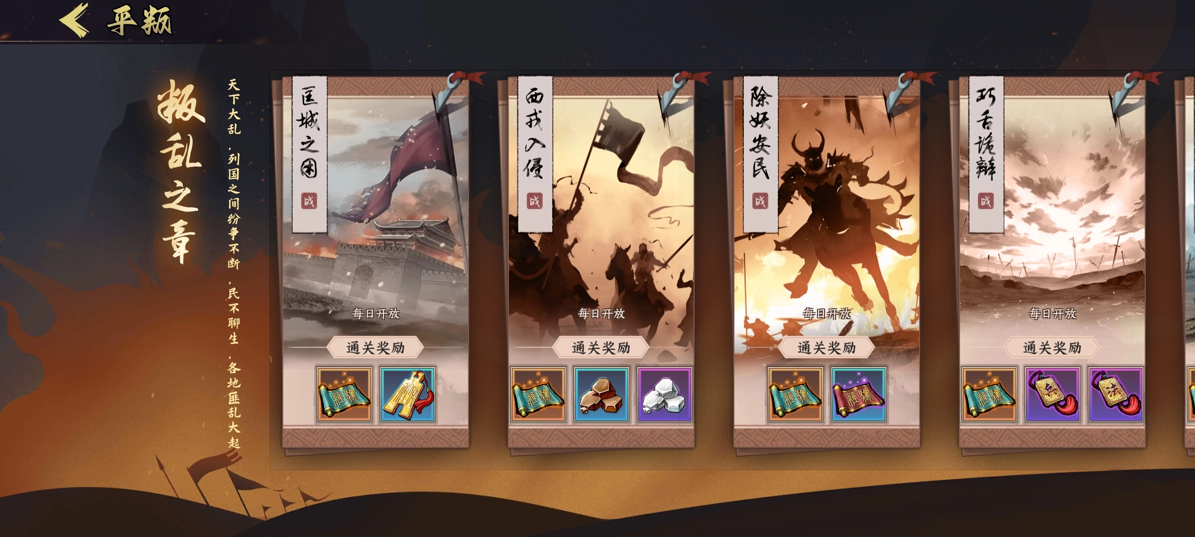 平叛副本是日常资源收益型副本,主要分类4种类型资源: