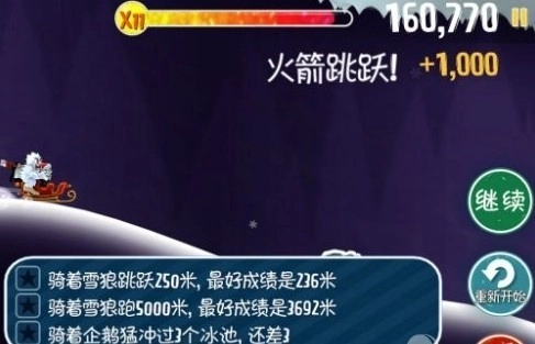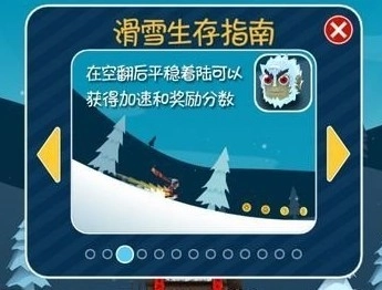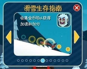 接着,在屏幕上方会有当前玩家获得奖励状态,玩家可以通过在滑行中收集金币奖励、完成高难度动作等获取奖励状态,这样就可以激活游戏中的高级工具,例如火箭船等,还可以和企鹅、雪怪人一同搭载着火箭船奔向远方。
