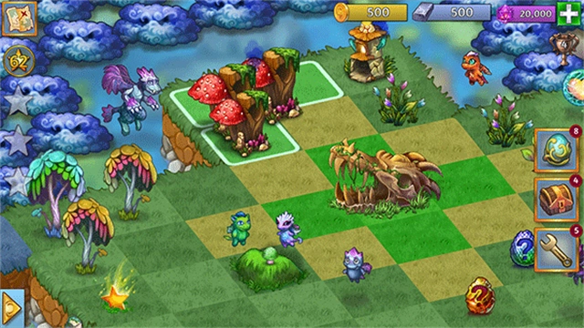 2、通过匹配蛋来孵化出实用的巨龙,这些巨龙会在山谷里四处漫步,采集各类物品供你进行匹配或使用。