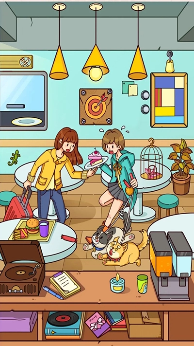 要操作图画得按亮两盏灯,千纸鹤得先把笼子打开才能拿到,用杯子里的水去浇花,唱盘要放到播放器上(会出现音符),把两根火腿肠分给两条狗,这样就能拿到蛋糕啦