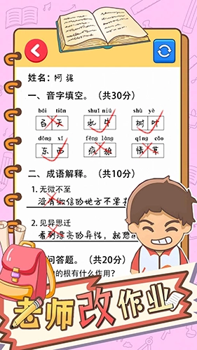 老师改作业最新版是一款备受玩家喜爱的休闲益智闯关游戏。在游戏里,你会化身老师批改学生试卷,面对他们千奇百怪的答案,定会让你忍俊不禁。不仅如此,游戏还融入了丰富多样的闯关内容,你能依据自己的喜好挑选关卡,每个关卡都经过精心设计,需要你充分开动脑筋,才能顺利快速通关。