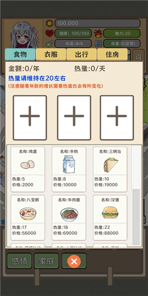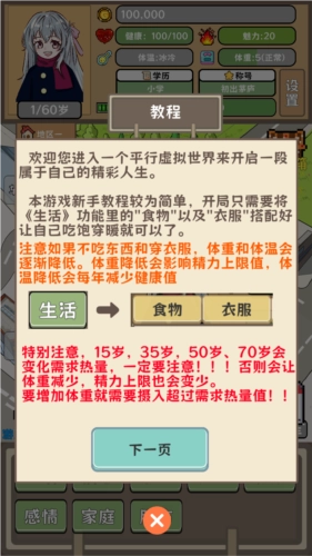 注意如果不吃东西和穿衣服,体重和体温会逐渐降低。体重降低会影响精力上限值,体温降低会每年减少健康值