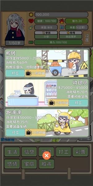6、打工:当余额达到十万以上时,可以兼顾赚钱与学习,逐步提升学历直至初中水平,之后可到餐饮店从服务岗位做起,争取升职成为店长。