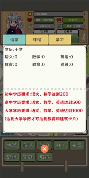 4、然后就是《学习》提升学历的地方,一部分玩法必须需要玩家达到相应学历才可以继续进行,请各位多多学习吧!