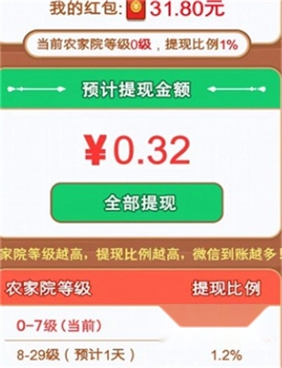 新手刚进游戏就能领取15元红包,完成一两单任务还能再得15元红包;新手首次提现满0.3元即可操作,提现比例为1%,农家院等级越高,对应的提现比例就越高。