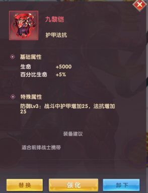 英雄可穿戴3件普通装备(武器、防具、鞋子),品质分为紫、橙、红、金四个品质,主要通过爬百族塔获得,通过爬塔获得积分,然后在商店用积分兑换。装备分为法术和物理属性的,还会附带像加攻击、加防御之类的属性,要根据英雄的特点,选择合适的装备。装备可强化,会消耗大量的金币,最高强化至20级。低品质的装备可合成高品质的装备(需强化满),同时会额外消耗合成石。装备建议合成和买成品同时进行,优先给主C把装备凑齐。
