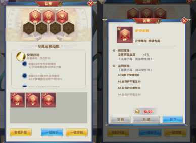 每个英雄的法宝都是专属的,对自身技能或属性有加成。法宝可消耗法宝精华强化,法宝强化对英雄能力的提升非常重要,有的英雄会因此发生质变。
