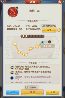 一共有6个神器,每个神器都具备独特技能。神器能够进行升星与强化操作,升星会提高神器技能的伤害,强化则能提升其基础属性。