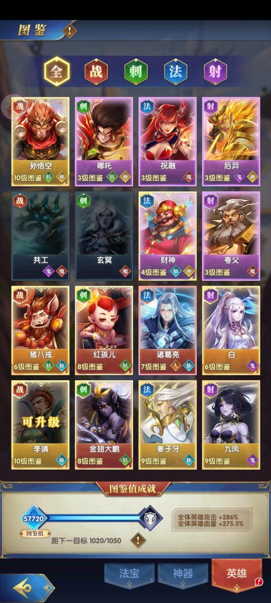 图鉴系统十分简易,主要分为英雄、法宝、神器这三大类别。每当获取新英雄、英雄成功升星,或者得到新的法宝与神器,亦或是法宝升星后,皆能够对相应的图鉴进行升级。而升级图鉴可获取全英雄的加成属性,这些加成属性颇为可观。