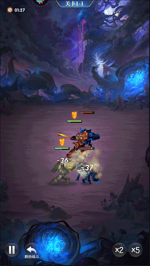 6、战斗开始,旁边的x2、x5选项可以帮助玩家快速战斗,后台战斗可以让玩家轻松度过这段时间;