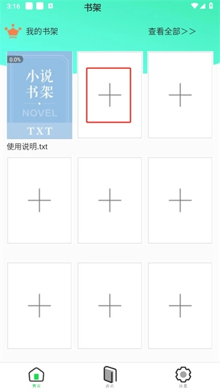 1. 在本站安装天天海棠小说阅读器,打开进入首页后,点击【加号图标】。