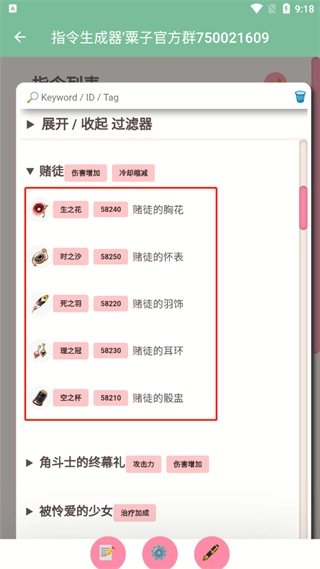 8、选择用户刚刚生存的指令组,再点击复制,粘贴给游戏内好友(默认都有一个server好友),需要注意的是生成器只能在私人服务器使用。