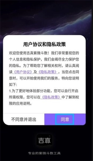 1. 开启吉真紫微斗数,浏览弹出的用户协议与隐私政策,然后点击【同意】。
