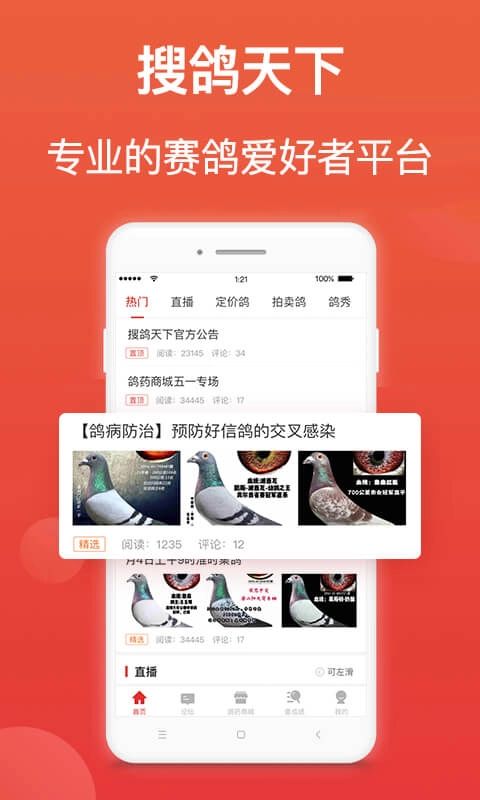 【直播拍鸽】在赛鸽头条的直播间里,你不仅能够与他人面对面交流,还能直接在直播间竞拍鸽子。一边欣赏心仪的鸽子,一边一键出价,从此再也不用担心买到与实物不符的鸽子啦! 【热门鸽闻】赛鸽头条会不定时地推送鸽界的时事热点,让你在第一时间掌握鸽界动态。而且,你还可以通过投稿,在首页发表属于自己的文章哦!
