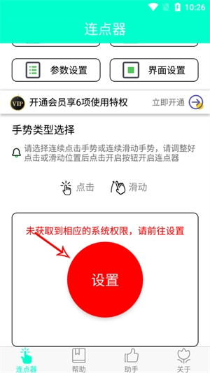 1、在本站安装智能连点器,在首页点击下方红色按钮进行设置。