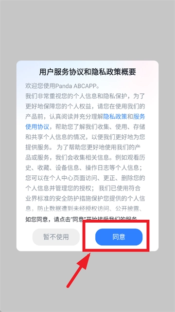 在本站下载并开启Panda ABC ,首先需同意用户服务协议以及隐私政策概要。
