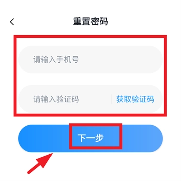 请输入手机号码,接着输入验证码,完成上述操作后,点击“下一步”,便可重置密码。