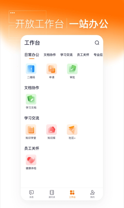 沟通相关内容包括:消息通知、公告、同事位置查询、通讯录等。
