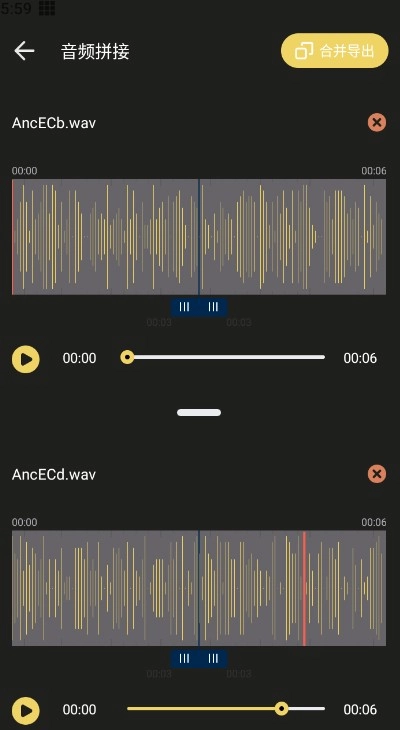 3、通过滑动红色线条来完成拼接,编辑完毕后,点击“合并并导出”即可。