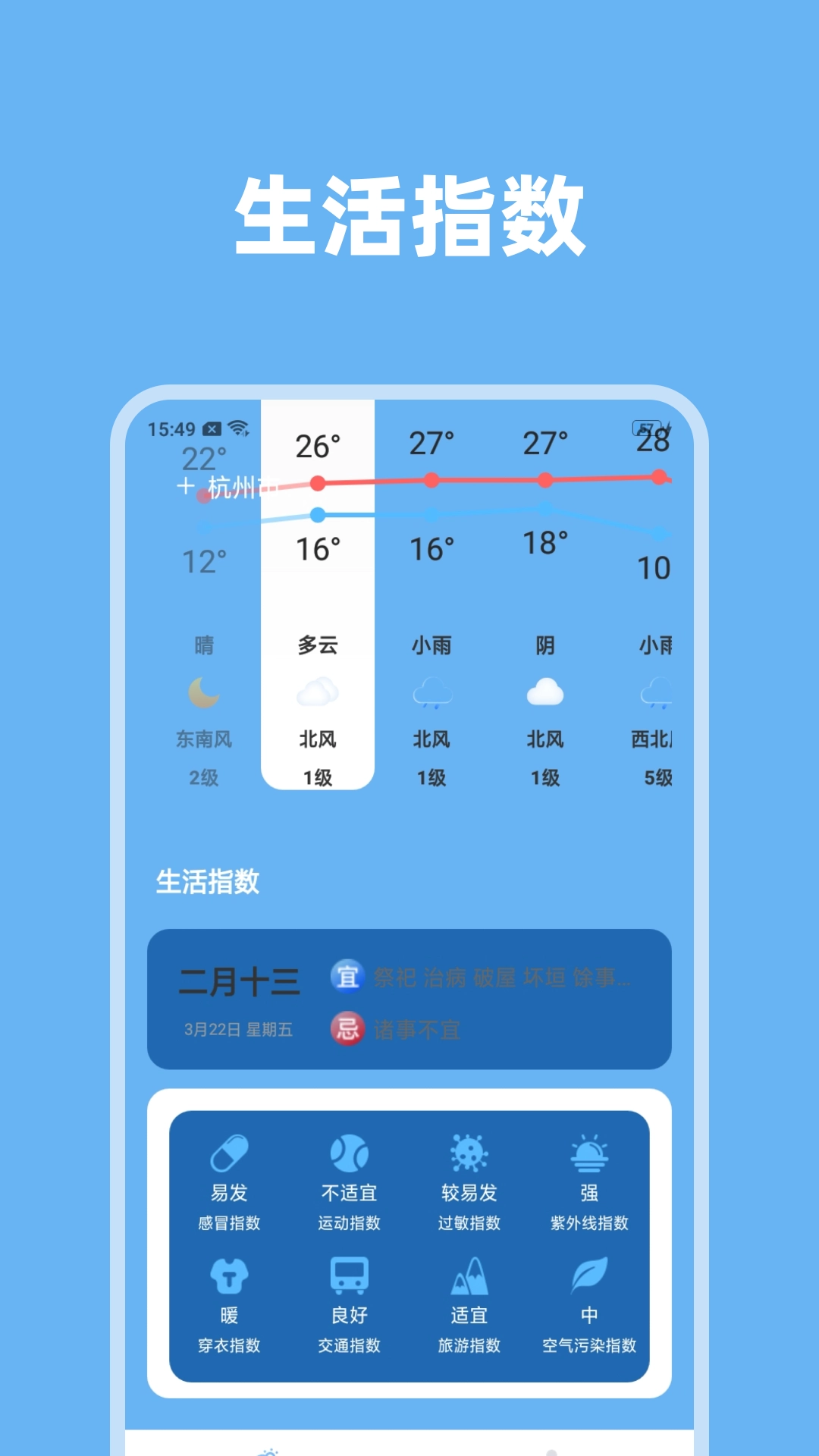 3、及时推送:及时推送生活指数,提醒需要外出的用户。天气情况一目了然,可以轻松处理天气预报和天气查询。
