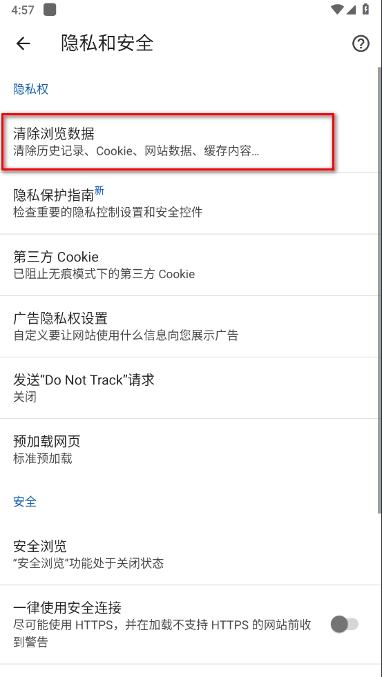 3. 在设置菜单中,向下滚动至“隐私和安全”部分。